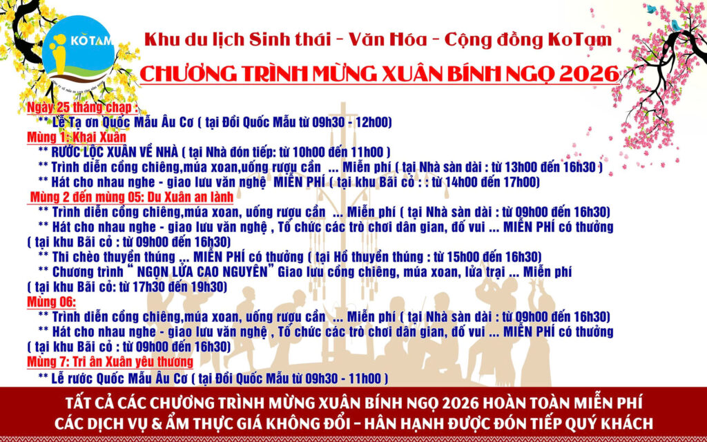 TIN KOTAM, Tin sự kiện tại Kotam 🎉CHÀO XUÂN BÍNH NGỌ 2026 TẠI KHU DU LỊCH KOTAM🎉 Xuất bản 10/02/202610/02/2026 by kotam 10 Th2 𝑲𝒐𝑻𝒂𝒎 𝒉𝒂̂𝒏 𝒉𝒂̣𝒏𝒉 𝒄𝒉𝒂̀𝒐 đ𝒐́𝒏 𝒒𝒖𝒚́ 𝒅𝒖 𝒌𝒉𝒂́𝒄𝒉 𝒗𝒐̛́𝒊 𝒏𝒉𝒊𝒆̂̀𝒖 𝒄𝒉𝒖̛𝒐̛𝒏𝒈 𝒕𝒓𝒊̀𝒏𝒉 đ𝒂̣̆𝒄 𝒔𝒂̆́𝒄: 𝑇𝑟𝑎𝑛𝑔 𝑡𝑟𝑖́ 𝑥𝑢𝑎̂𝑛 𝑟𝑢̛̣𝑐 𝑟𝑜̛̃ – 𝑐ℎ𝑒𝑐𝑘-𝑖𝑛 đ𝑜́𝑛 𝑥𝑢𝑎̂𝑛. 𝐻𝑎́𝑡 𝐾𝑎𝑟𝑎𝑜𝑘𝑒𝑐𝑎́𝑐 𝑡𝑟𝑜̀ 𝑐ℎ𝑜̛𝑖 𝑑𝑎̂𝑛 𝑔𝑖𝑎𝑛đ𝑢𝑎 𝑡ℎ𝑢𝑦𝑒̂̀𝑛 𝑡ℎ𝑢́𝑛𝑔. 𝐺𝑖𝑎𝑜 𝑙𝑢̛𝑢 𝑣𝑎̆𝑛 ℎ𝑜́𝑎 – 𝑘ℎ𝑜̂𝑛𝑔 𝑔𝑖𝑎𝑛 𝑐𝑜̂̀𝑛𝑔 𝑐ℎ𝑖𝑒̂𝑛𝑔, 𝑛ℎ𝑎̀ 𝑠𝑎̀𝑛 𝑡𝑟𝑢𝑦𝑒̂̀𝑛 𝑡ℎ𝑜̂́𝑛𝑔. 𝑇ℎ𝑎𝑚 𝑞𝑢𝑎𝑛 𝑐𝑎̉𝑛ℎ 𝑞𝑢𝑎𝑛 𝑠𝑖𝑛ℎ 𝑡ℎ𝑎́𝑖: 𝑡ℎ𝑎́𝑐 𝑛𝑢̛𝑜̛́𝑐, ℎ𝑜̂̀ 𝑛𝑢̛𝑜̛́𝑐, 𝑣𝑢̛𝑜̛̀𝑛 ℎ𝑜𝑎, 𝑐𝑎̂̀𝑢 𝑔𝑜̂̃ 𝑡ℎ𝑜̛ 𝑚𝑜̣̂𝑛𝑔. 𝐶𝑢̀𝑛𝑔 𝑔𝑖𝑎 đì𝑛ℎ 𝑣𝑎̀ 𝑏𝑎̣𝑛 𝑏𝑒̀ đ𝑜́𝑛 𝑚𝑜̣̂𝑡 𝑚𝑢̀𝑎 𝑥𝑢𝑎̂𝑛 𝑡ℎ𝑎̣̂𝑡 𝑡𝑟𝑜̣𝑛 𝑣𝑒̣𝑛 𝑡𝑎̣𝑖 𝐾𝑜𝑇𝑎𝑚! kotam Gieo mầm xanh giữa đại ngàn
