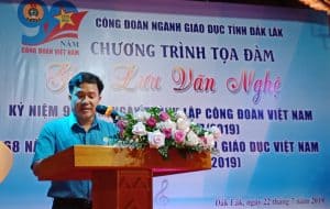 Sáng 22/7/2019, tại thành phố Buôn Ma Thuột, Công đoàn ngành Giáo dục tỉnh Đắk Lắk tổ chức Chương trình tọa đàm và giao lưu văn nghệ giữa các cán bộ công đoàn cơ sở của ngành Giáo dục nhân kỷ niệm 90 năm Ngày thành lập Công đoàn Việt Nam (28/7/1929 – 28/7/2019) và 68 năm Ngày thành lập Công đoàn Giáo dục Việt Nam (22/7/1951 – 22/7/2019). Tham dự Chương trình có bà Nguyễn Thị Lý – Ủy viên Ban Thường vụ, Trưởng Ban tổ chức Liên đoàn Lao động tỉnh Đắk Lắk; ông Lưu Tiến Quang – Chủ tịch Công đoàn ngành Giáo dục tỉnh; bà Lê Thị Thanh Xuân – Phó Giám đốc Sở Giáo dục và Đào tạo, Phó Chủ tịch Công đoàn ngành Giáo dục tỉnh; các đồng chí Nguyên là Chủ tịch Công đoàn ngành Giáo dục tỉnh qua các thời kỳ và hơn 300 cán bộ Công đoàn của 62 công đoàn cơ sở trực thuộc Công đoàn ngành Giáo dục tỉnh Đắk Lắk.